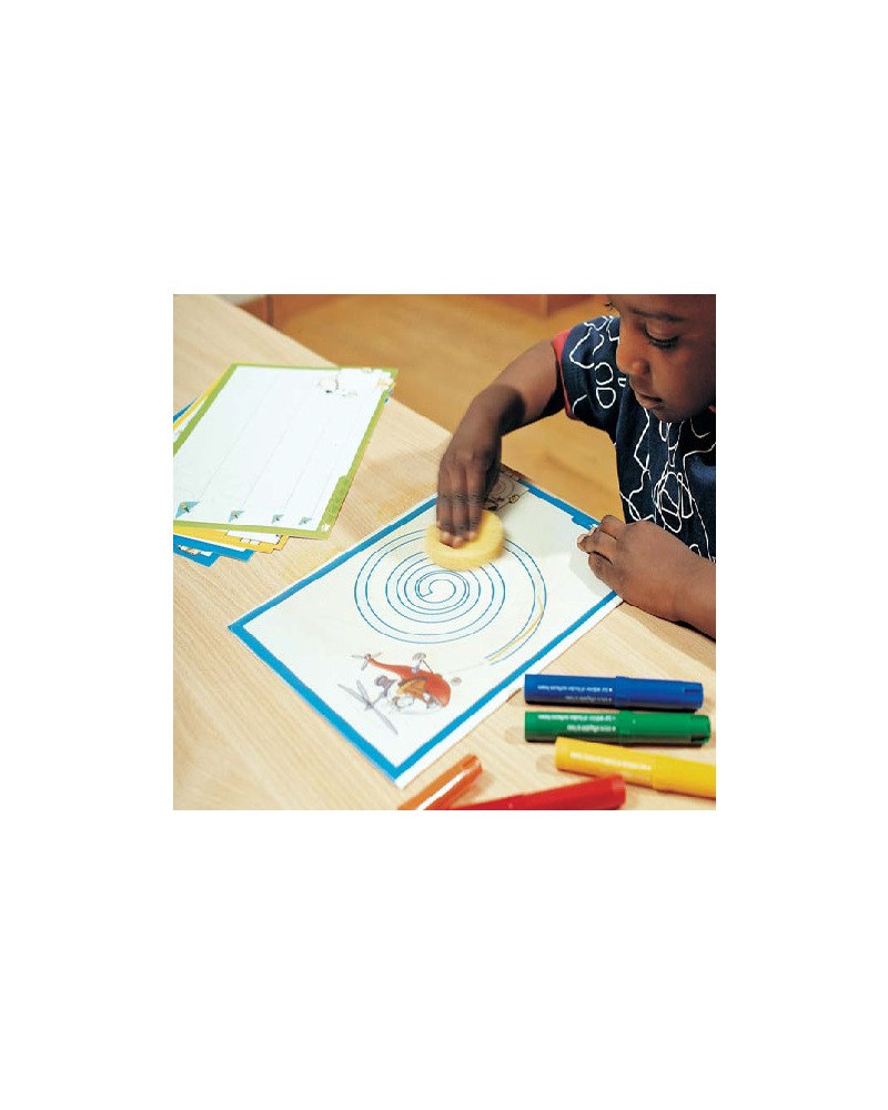 Questo schedario suddiviso in 5 serie da 6 schede progressive aiuta il bambino a dominare lo spazio grafico, le traiettorie e le forme prefiguranti la scrittura. È importante che il bambino acquisisca disinvoltura e flessibilità nel gesto grafico così da iniziare a scrivere con il massimo del piacere possibile. Le illustrazioni mostrano innanzitutto situazioni in cui ciascun personaggio è motivato da uno scopo, per poi presentare forme decontestualizzate. Progressione dei tracciati: linee oblique, linee dritte lunghe, linee dritte, interlinee grandi, forme di prescrittura per formare lettere. Contenuto: 30 schede 30 x 20,5 cm., 1 guida didattica
