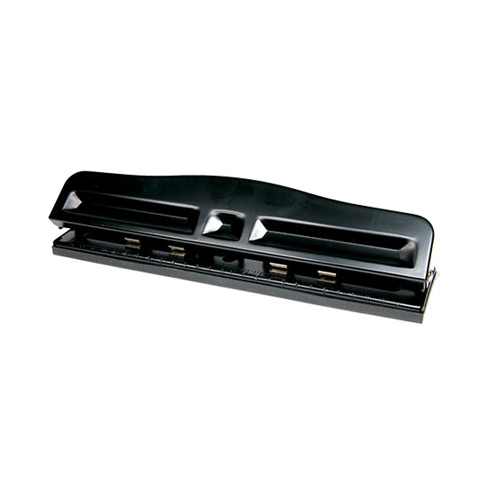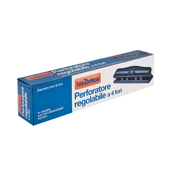 Perforatore a 4 fori in metallo regolabile. Perfora fino a 10 fogli con punzoni regolabili. Colore nero.