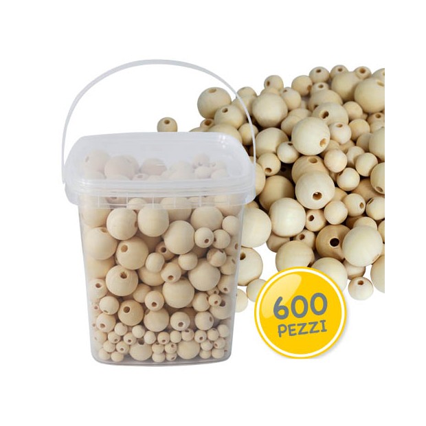13284: perline tonde in legno, colore naturale in set da 600 pezzi - diametri assortiti.