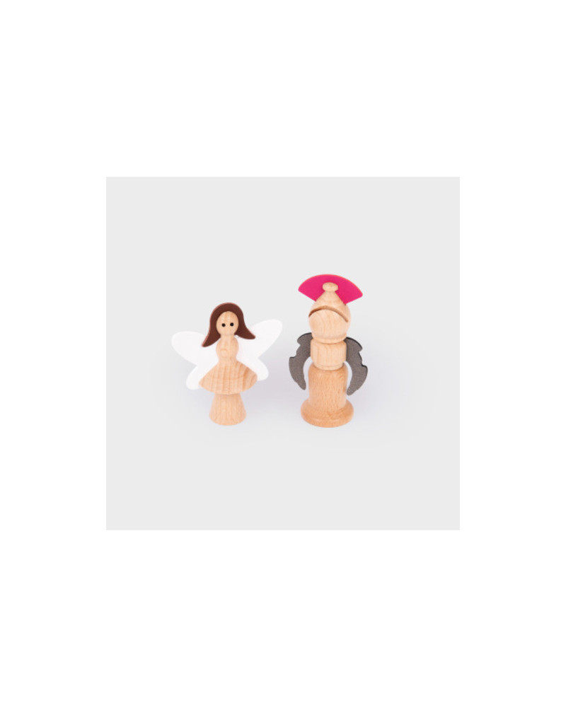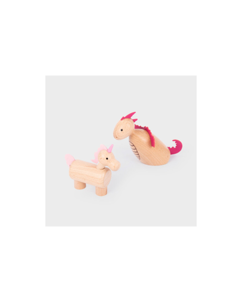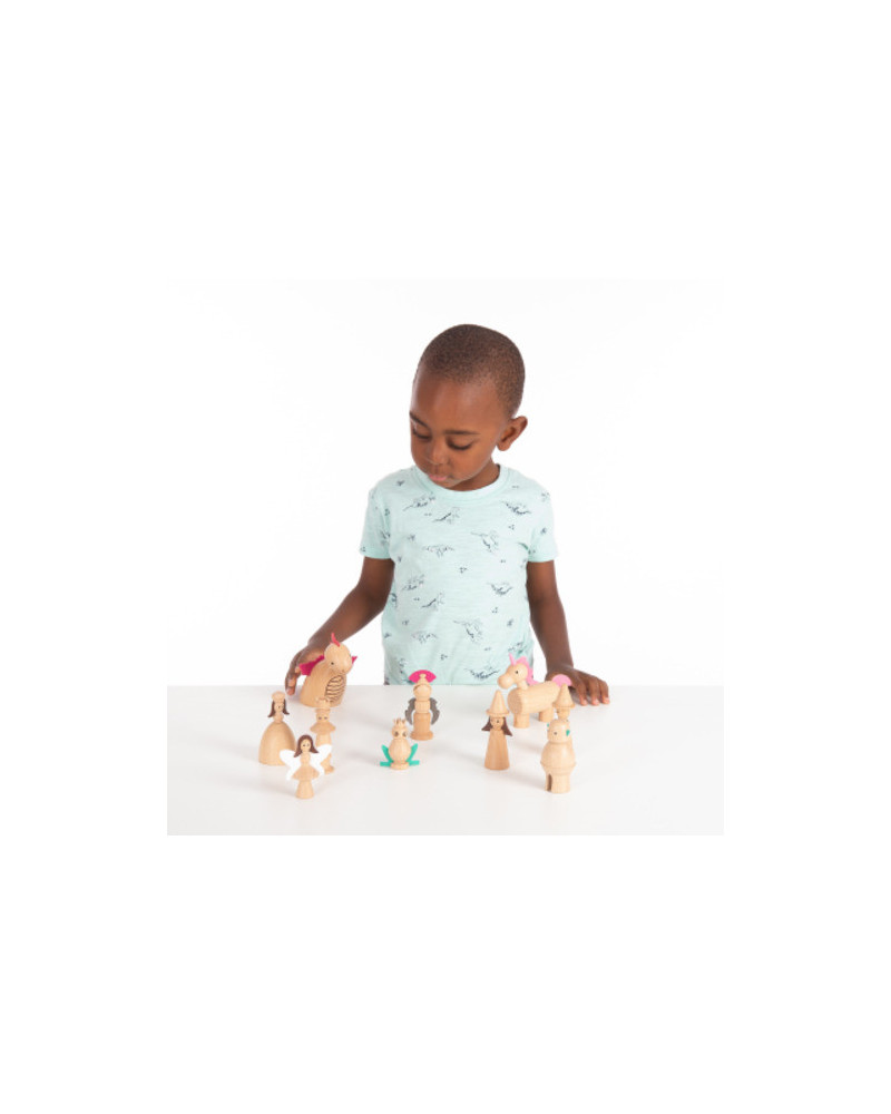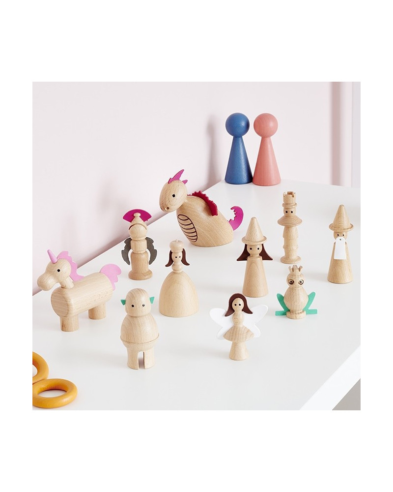 Set in faggio massiccio con dettagli in ecopelle, include un re, una regina, una strega, un mago, una fata, un cavaliere, un drago, un unicorno, un principe ranocchio, un orco e una custodia in cotone con coulisse. Dimensioni: drago 14 cm. Rana 5,5 cm. Da 3+ anni.