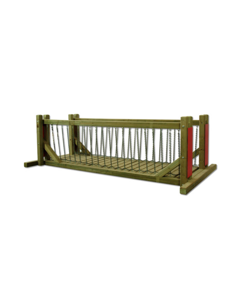 Montanti e corrimano in legno di pino impregnato in autoclave, tavole in legno sostenute da catene in acciaio, pannelli laterali in multistrato di betulla, cappellotti copri-palo in polietilene colorato. Bulloneria di fissaggio zincata in classe 8.8. Dimensioni cm. 318x170x100