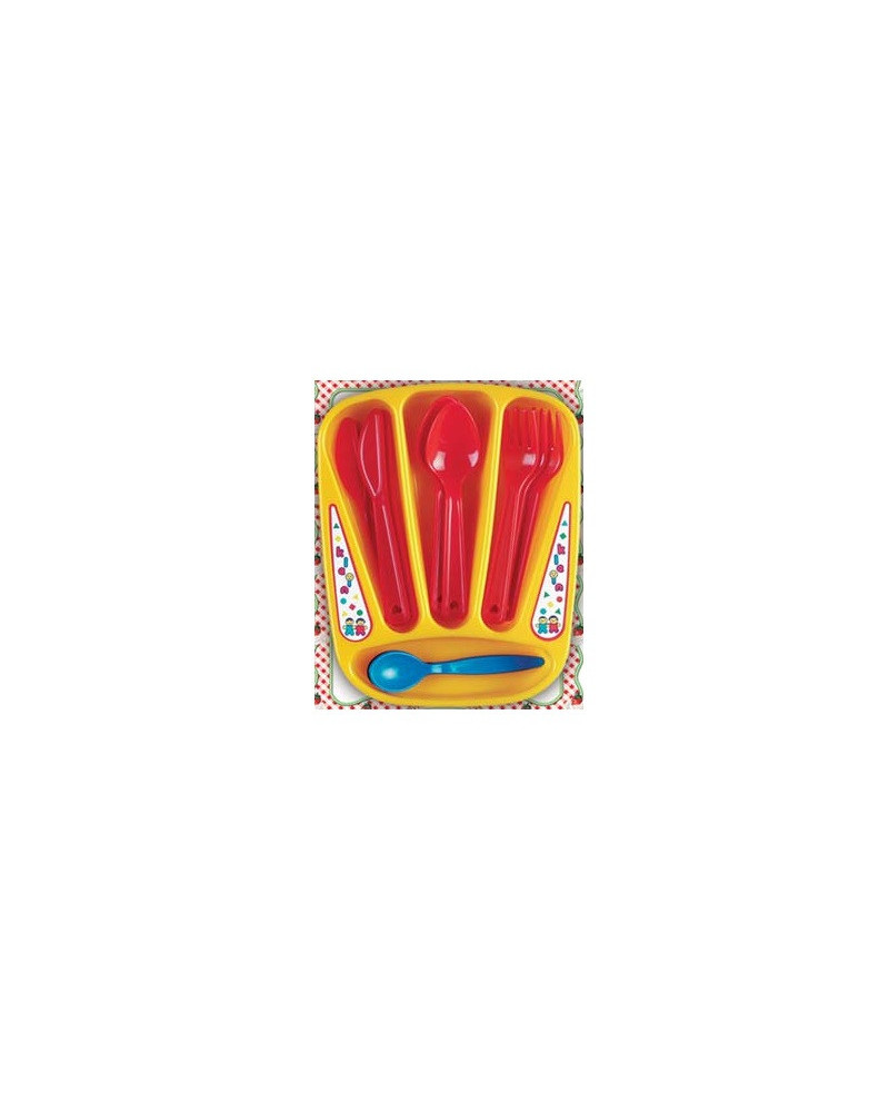 Set portaposate contenente: 3 coltelli, 3 forchette, 3 cucchiai, e 3 cucchiaini in materiale colorato, flessibile e antiurto. Lunghezza forchetta 13 cm. Da 3+ anni.