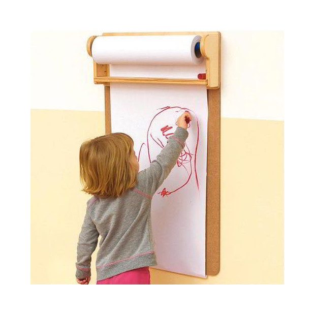 Supporto a muro per rotoli di carta, dotata di mensola per riporre i colori.