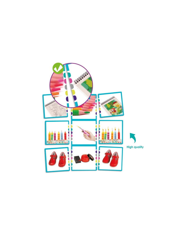 Gioco di associazione, con fotografie divise in serie temporali di tre immagini che rappresentano prima e dopo una determinata azione. 10 fogli illustrati e 60 carte plastificate; misura carta cm 7,5 x 7,5. Da 3+ anni.