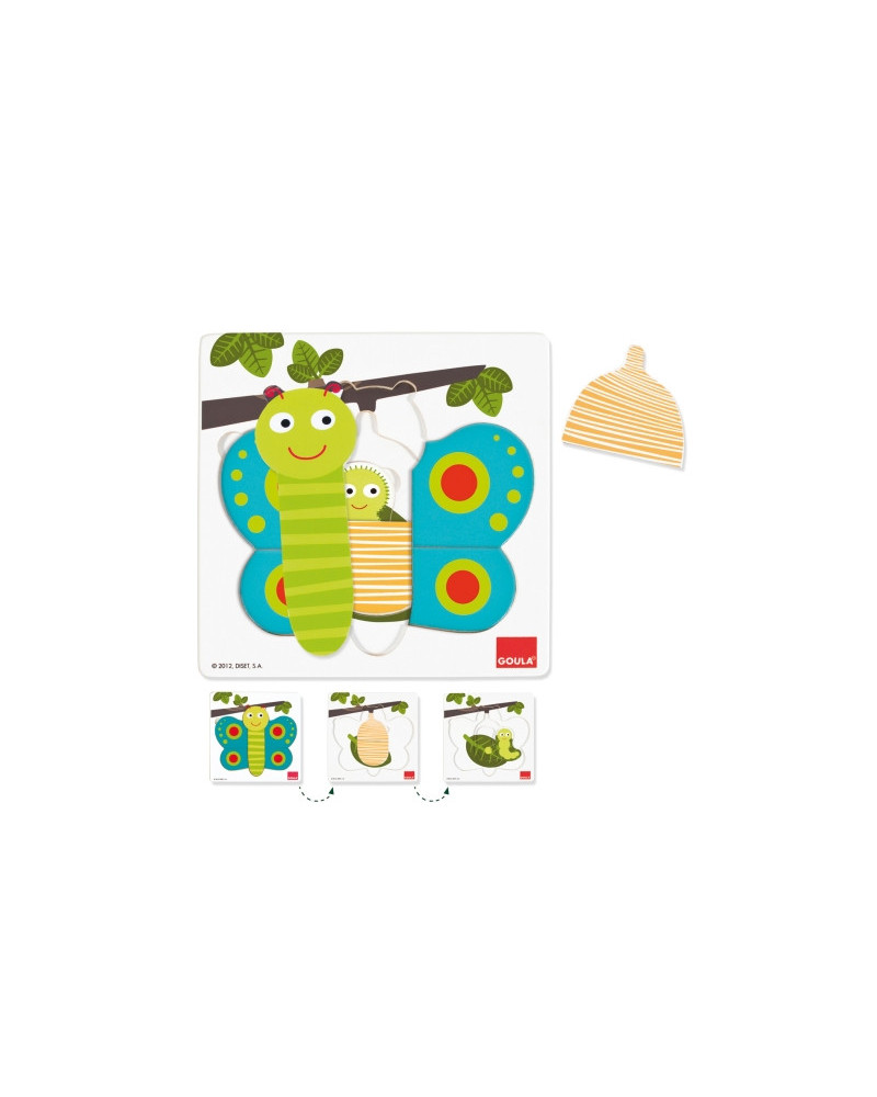 Un puzzle in legno su 3 livelli che mostra i processi di crescita dal bruco alla farfalla e viceversa. Dimensioni: 19 x 19 cm.