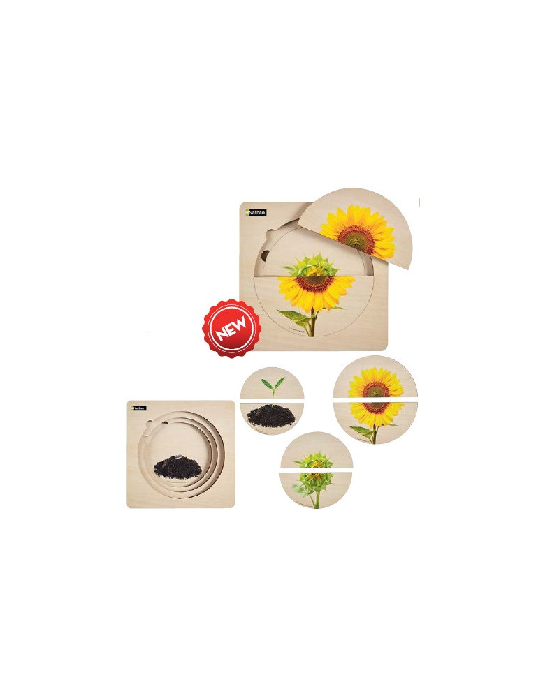 Puzzle a strati in legno verniciato che illustra in 3 fasi la crescita della pianta. Dimensioni: 20 x 20 x 1,8 cm. Da 3+ anni.
