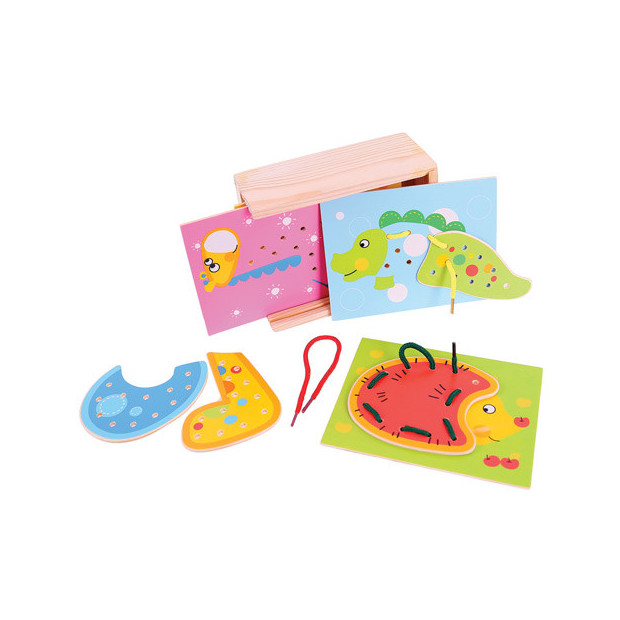 Il bambino deve completare gli animali infilando i lacci negli appositi fori e allacciando i vari pezzi alla tavola. Un modo unico per sviluppare abilità di destrezza e coordinazione occhio-mano, aumentando anche i livelli di concentrazione. Pratica scatola in legno contenente 8 pezzi pezzi in legno + 7 lacci. Puzzle le allacciature - Set 4 pezzi. Soggetti Animali. Dimensioni scatola cm. 12x6x15 h. Marchio di qualità garantito BIGJIGS