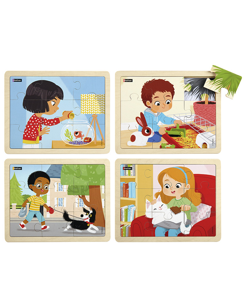 Quattro puzzle da 9 pezzi sul tema della cura degli animali: do da mangiare ai miei pesci, cambio la lettiera del mio coniglio, porto fuori il mio cane e spazzolo il mio gatto. Modelli rimovibili in bianco e nero. Dimensioni: 23 x 18 x 1 cm.