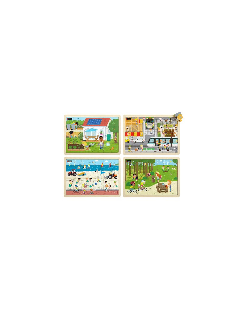 Quattro puzzle da 28 e 35 pezzi sul tema dell'eco-cittadinanza da comporre con o senza modelli rimovibili in bianco e nero. Dimensione: 30 x 21 x 1 cm. Da 4+ anni.