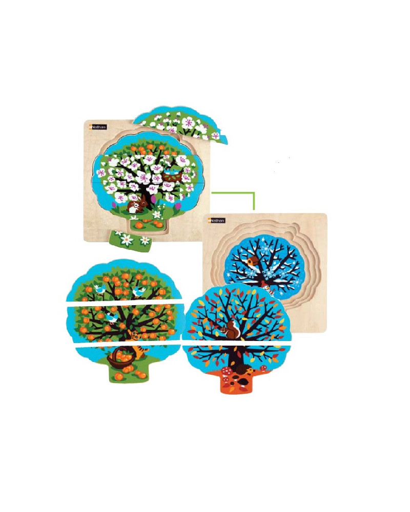Puzzle che rappresenta il cambio delle 4 stagioni. Set da 9 pezzi in legno verniciato. Dimensioni: 20 x 20 x 1,5 cm. Da 3+ anni.
