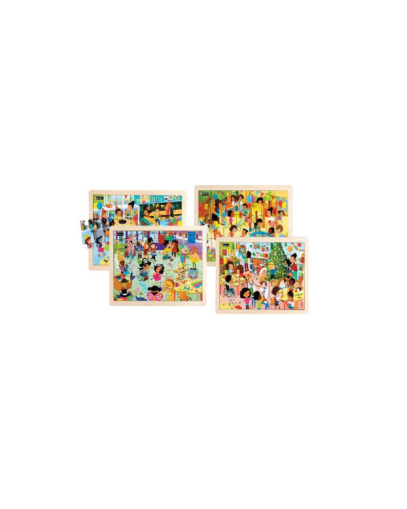 Quattro puzzle da 15 pezzi per rappresentare le celebrazioni del nuovo anno, del carnevale, di compleanni e di Natale. Dimensioni: 30 x 21 x 1 cm.