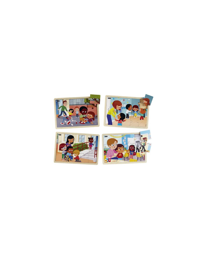 Quattro puzzle sul tema del rispetto e aiuto agli altri: tristezza, dolore, disabilità e molestie. Modelli rimovibili in bianco e nero. Dimensioni: 30 x 21 x 1 cm. Da 4+ anni.