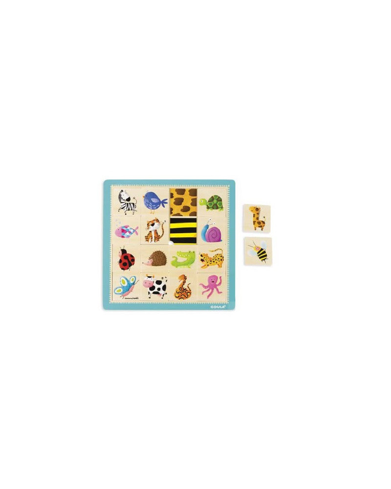 Puzzle correttivo in legno composto da 16 tasselli. L'obbiettivo è quello di associare ogni animale al suo mantello. Dimensioni: 28 x 28 x 0,7 cm.