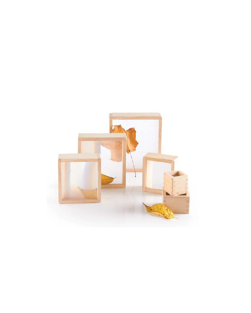 Set da 6 blocchi impilabili in legno con inserto in acrilico lenticolare (lente che ingrandisce) dotati di cornice in legno e angoli arrotondati. Ideale per fare esplorazioni tattili generiche e o di materiali che si trovano in natura. Perfetto per il gioco di gruppo. Dimensione quadrato più grande 18 x 18 x 2 cm.