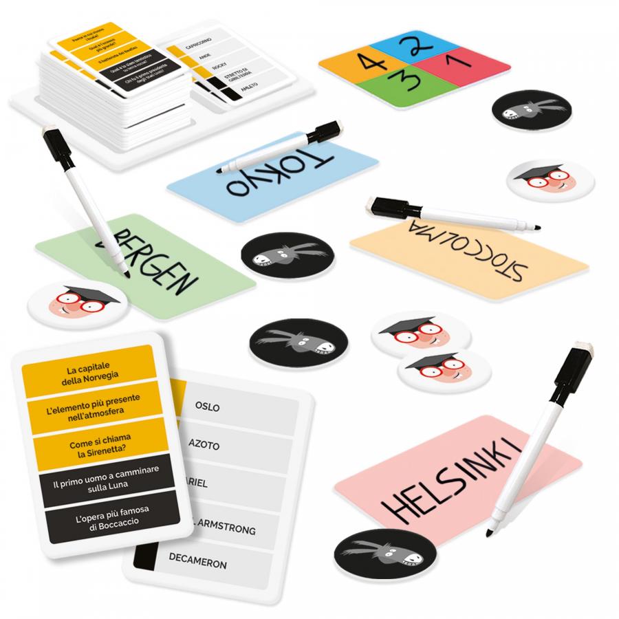 Contenuto: 55 carte quiz; 1 plancia delle carte; 4 lavagnette; 4 pennarelli cancellabili; 4 gettoni SECCHIONE; 4 gettoni ASINO; 1 Scheda segnapunti; Regolamento