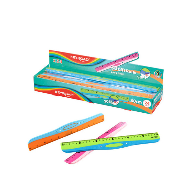 Righello dai colori trendy, impugnatura rivestita in soffice gomma per una migliore presa. Facile da sollevare, gradazione di facile lettura. Disponibile in vari colori. Righello dimensione cm.30.
