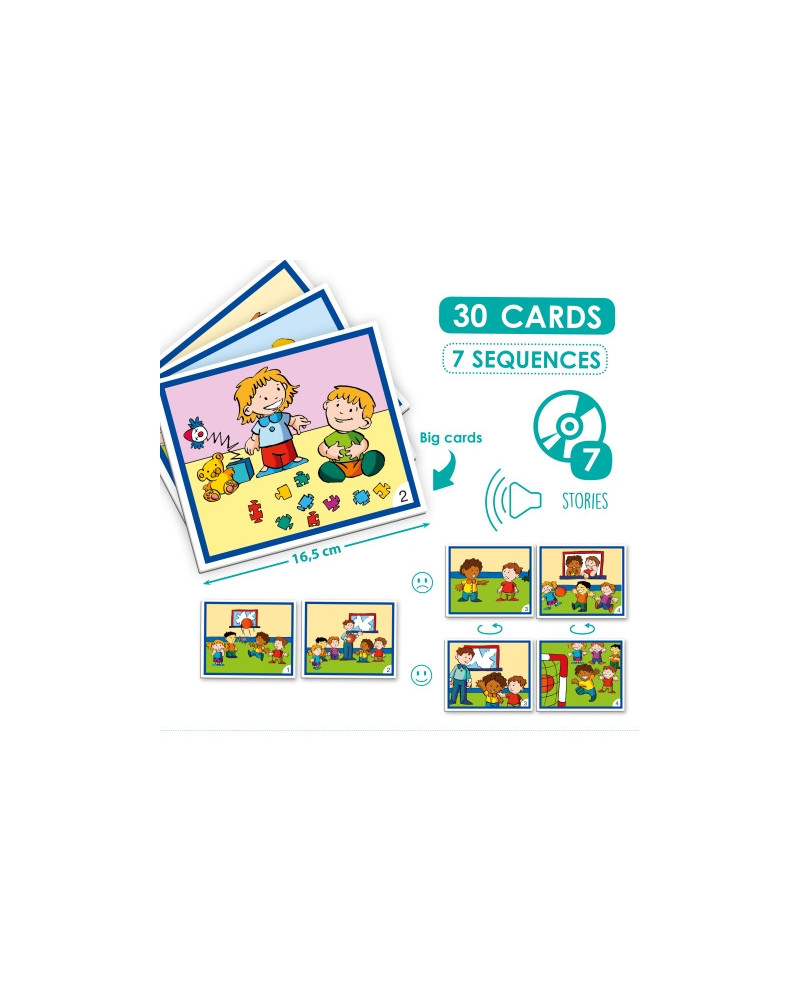 Contiene 7 semplici storie che raccontano due modi diversi di risolvere conflitti e mostrano le conseguenze di prendere una giusta o una sbagliata decisione. Ogni storia si sviluppa con 4 schede e le ultime 2 sono double-face per mostrare i due finali possibili. Contenuto: 30 carte plastificate 13,5 x 16,5 cm, 4 porta carte e 1 CD MP3 Da 3+ anni.