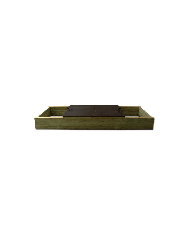 Sabbiera composta da sponde in legno di pino impregnato; coperchi scorrevoli in carplay; maniglioni in acciaio verniciato; bulloneria di fissaggio zincata in classe 8.8. Età d’uso consigliata 2/6 anni. Dimensioni cm 320x130x30h