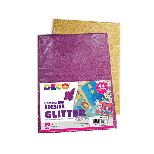 Sagome in gomma crepp glitterata ADESIVE, busta 44 pezzi colori assortiti.
