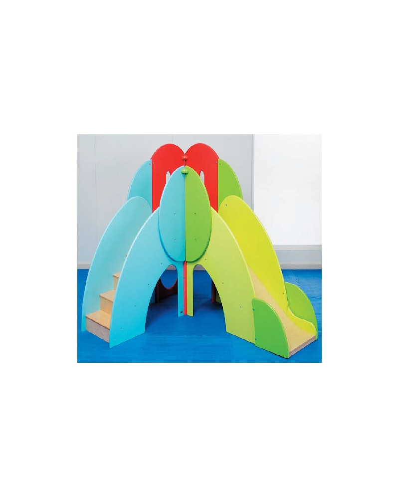 Struttura in legno impiallacciato rivestito con vernice trasparente e pannelli in MDF laccati. Scaletta, scivolo e una piattaforma quadrata da unire in linea o ad angolo. Passaggi sottostanti con archi e oblò. Dimensioni in linea cm 286x53x129, ad angolo retto cm 153x186x129. Fornito in kit di montaggio. Da 15 mesi.