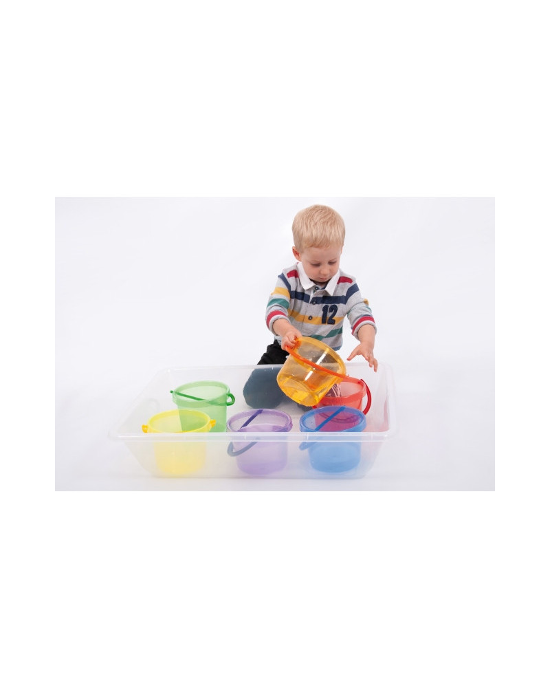 Divertenti secchielli impilabili colorati, della dimensione perfetta per i bambini da usare nel gioco esplorativo con sabbia e acqua, o per mescolare e abbinare i colori. Diametro 16,2 x1 2,2 cm. Set da 6 pz.