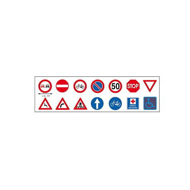 Confezione 14 segnali stradali cm. 30 x 30 circa + 24 perni (per fissare i cartelli ai bastoni).