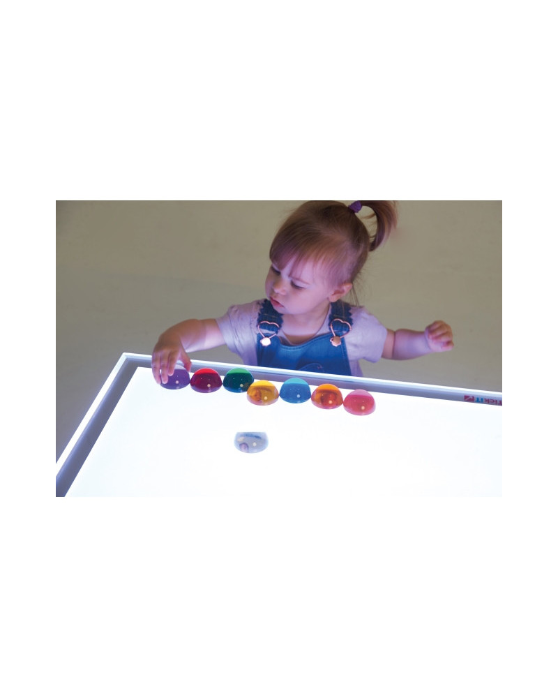 Set di otto semisfere in plastica traslucida in otto colori diversi. Guardando attraverso a ciascuna semisfera - singolarmente o accoppiata a un’altra - i bambini vedranno la realtà in altre tonalità e comprenderanno il concetto di colori primari e secondari. Possono essere utilizzate anche come lenti di ingrandimento Diametro 5 cm.