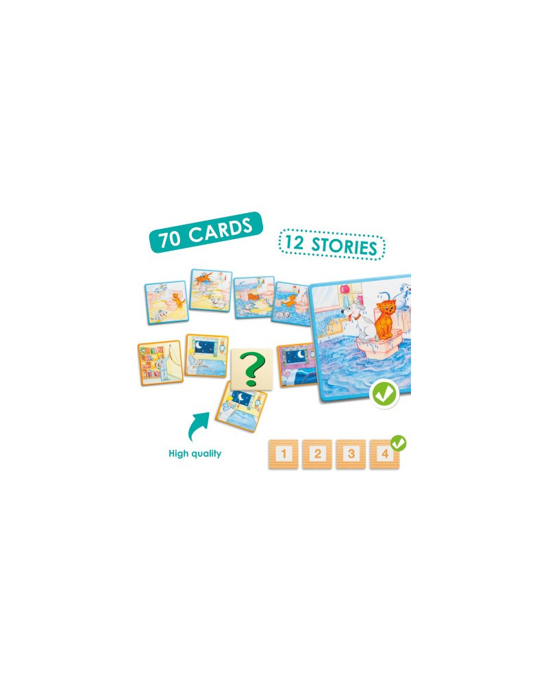 Gioco composto da 70 schede con vignette che contengono 12 divertenti storie che narrano situazioni che si svolgono abitualmente nel contesto di una casa. Inoltre le carte con il punto di domanda consentono al bambino di immaginare un finale diverso. Dimensioni carta: 9 x 9 cm. Da 3+ anni.