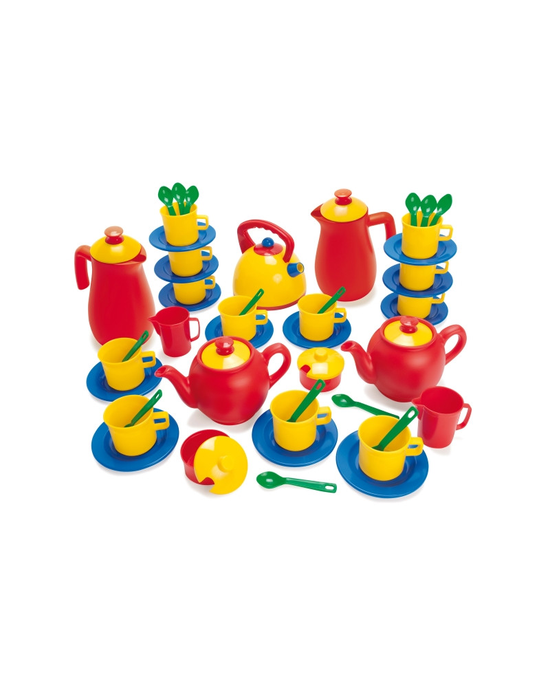 Servizio da caffè in legno robusto con dettagli in velcro composto da 1 vassoio, 1 caffettiera, 1 zuccheriera, 1 lattiera, 2 tazze con piattini, 2 cucchiaini, piatto con biscotti e due dischetti di tè e caffè da mettere nelle tazze. Totale 15 pezzi. Dimensione caffettiera 12 x 6,5 x 11 cm. Da 2+ anni.