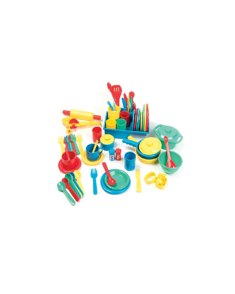 Set composto da 71 pezzi di plastica. Forchette e coltelli sono estremamente sicuri e tutti i pezzi possono essere messi in lavastoviglie. Dimensione piatto grande 13,5cm. Da 3+ anni.