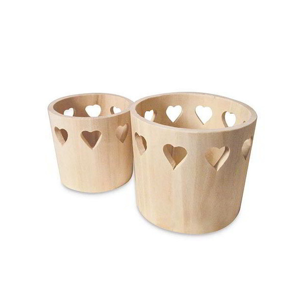 Oggetti in legno ideali come base per decoupage, pirografia, pittura ecc. Set 2 vasi in legno con cuori, dimensione max diametro cm. 18 x 16 h