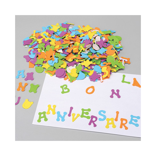 Soffici sagome ADESIVE in gomma crepp assortite in tanti simpatici soggetti. Possono essere incollate con facilità per impreziosire disegni, lavoretti, oggetti. Busta 405 lettere ADESIVE in EVA