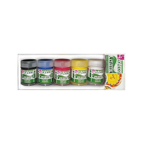 Set 5 flaconi 35 ml colori primari (bianco, nero, rosso, giallo, blu) per ceramica, porcellana e terracotta.