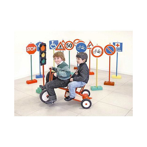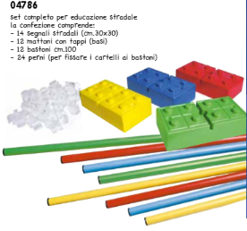 Set completo per educazione stradale la confezione comprende: 14 segnali stradali (cm. 30 x 30); 12 mattoni con tappi (basi); 12 bastoni cm. 100; 24 perni (per fissare i cartelli ai bastoni).