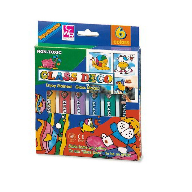 Set Glass DECO contiene 5 colori 10,5 ml + 1 liner nero 10,5 ml + 1 film trasparente. Colori riposizionabili adatti a vetro, plexiglass, plastica.