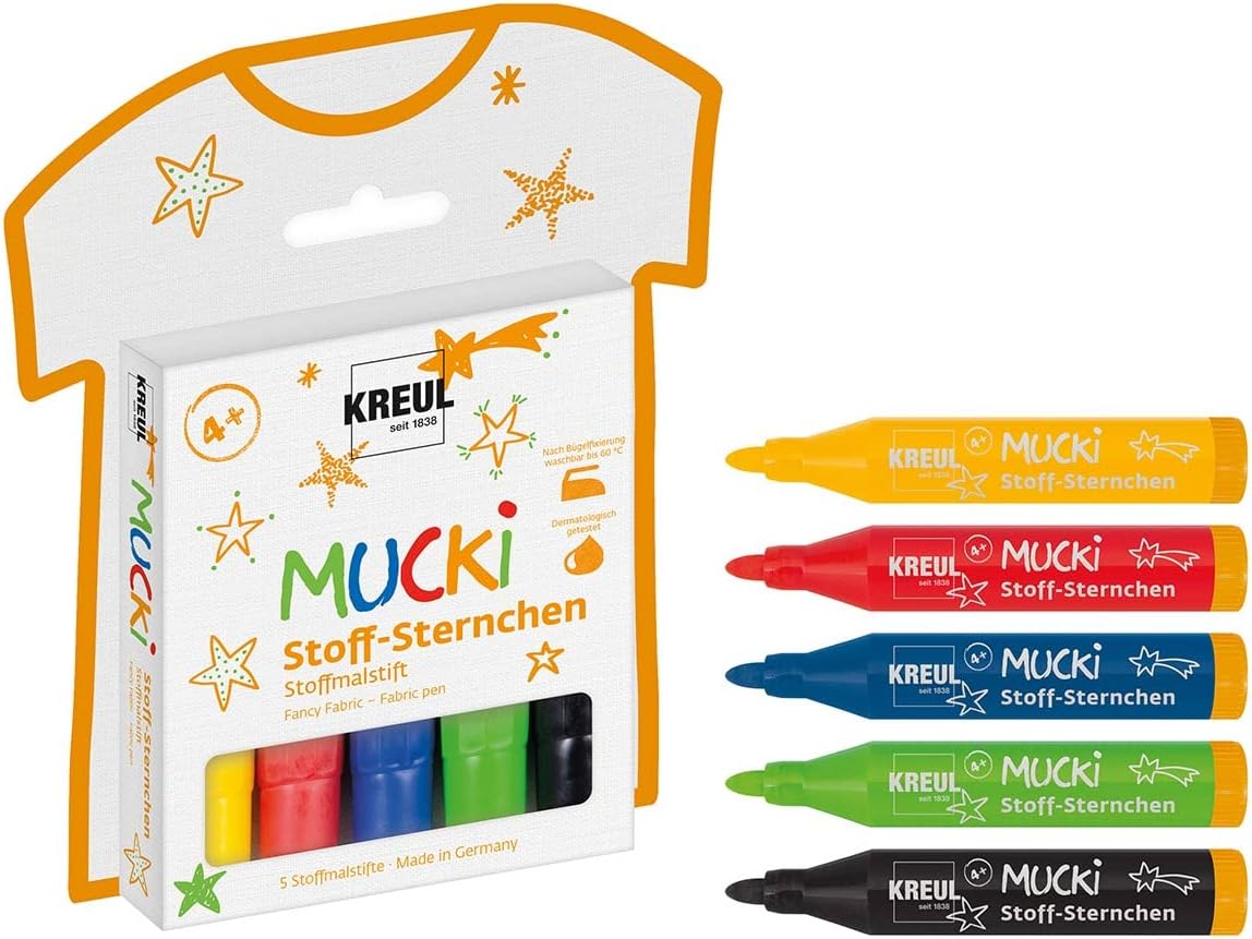 Pennarelli per tessuti MUCKI in 5 colori (giallo, rosso, blu, verde, nero). Colori brillanti dal tratto spesso per bambini, adatti a stoffe e tessuti.