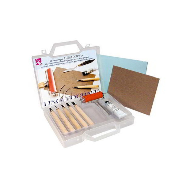 Valigetta per incisione su linoleum. Contiene: 5 scavini, un tubo inchiostro ml. 22, rullo cm. 6, una tavoletta linoleum cm. 9×12.