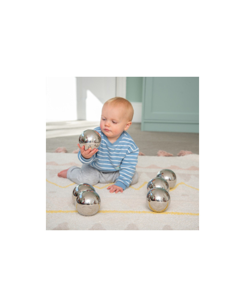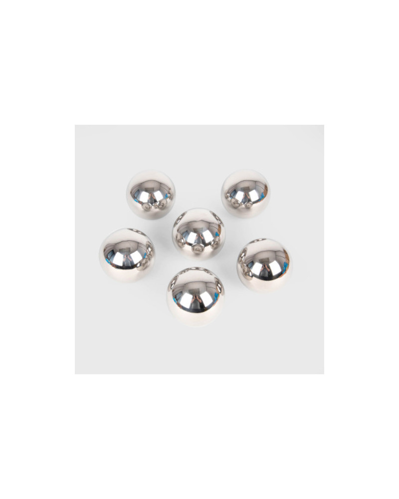Un set di 6 sfere a specchio che sembrano identiche ma tutte hanno caratteristiche diverse. Alcune oscillano quando schiacciate, o rotolano seguendo una linea non retta, altre possono essere agitate e produrre un suono. La superficie a specchio fornisce un affascinante riflesso distorto. Realizzate in robusto acciaio inox. Diametro 10 cm.