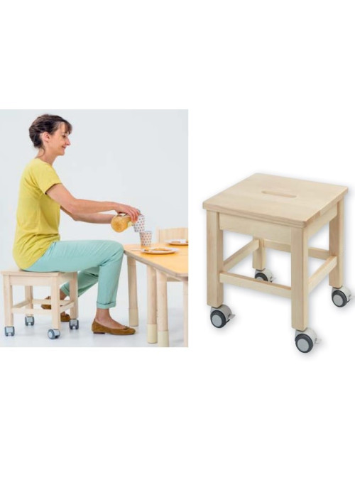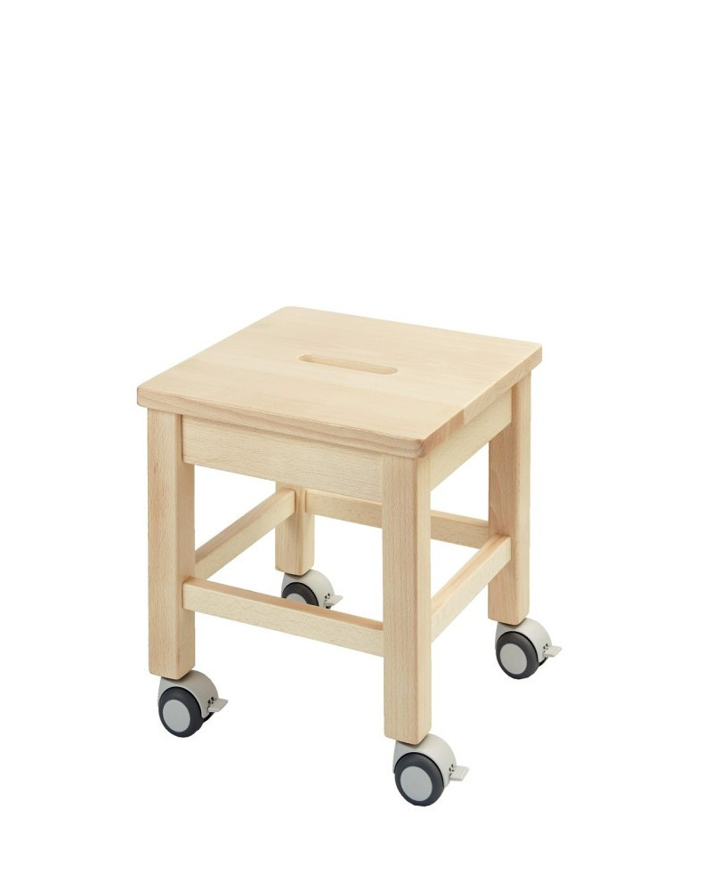 Sgabello robusto ed ergonomico per muoversi alla stessa altezza dei bambini. Struttura e piedi in faggio massello verniciato al naturale, completo di 4 ruote silenziose, anti-traccia e frenanti. Dotato di maniglia sulla seduta per spostarlo agevolmente. Fornito in kit di montaggio. Dimensioni cm. 33x33x35h