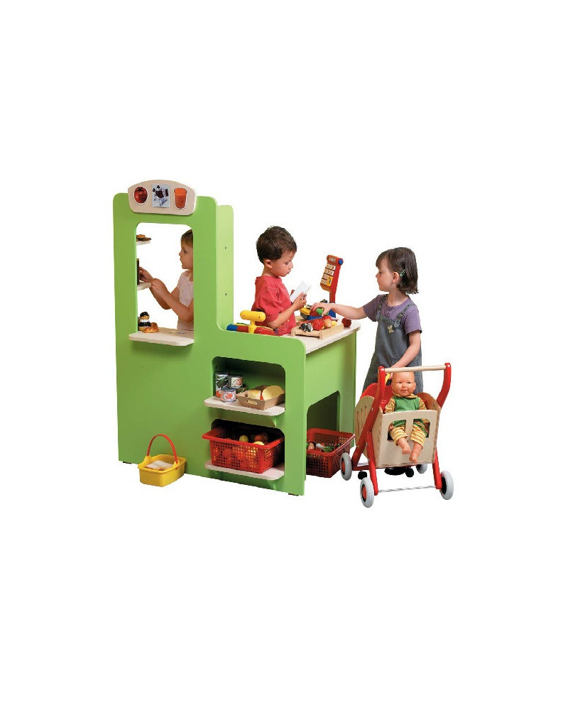 Struttura ad angolo in laminato colore verde e betulla con angoli arrotondati. Altezza bancone cm 60. Senza accessori. Fornito di istruzioni per il montaggio. Dimensioni 100 x 86 x 120 cm. Da 3+ anni.