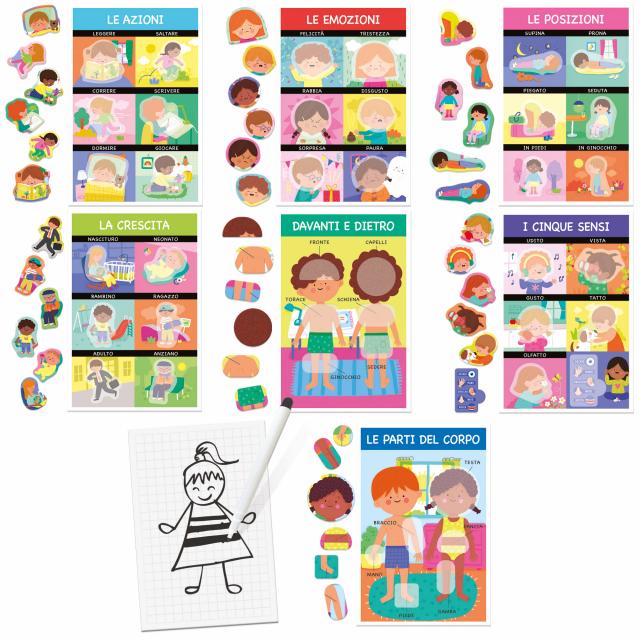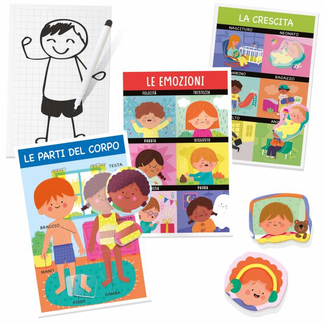 Un divertente gioco ad incastri per riconoscere la propria identità fisica ed emotiva. Il bambino scopre le parti e le posizioni del corpo, i cinque sensi, le espressioni del viso e altro ancora. In più, rappresenta il corpo umano disegnandolo. CONTENUTO: 7 cartelle del corpo umano; 42 sagome ad incastro; 1 lavagnetta per disegnare; 1 pennarello disegna e cancella.