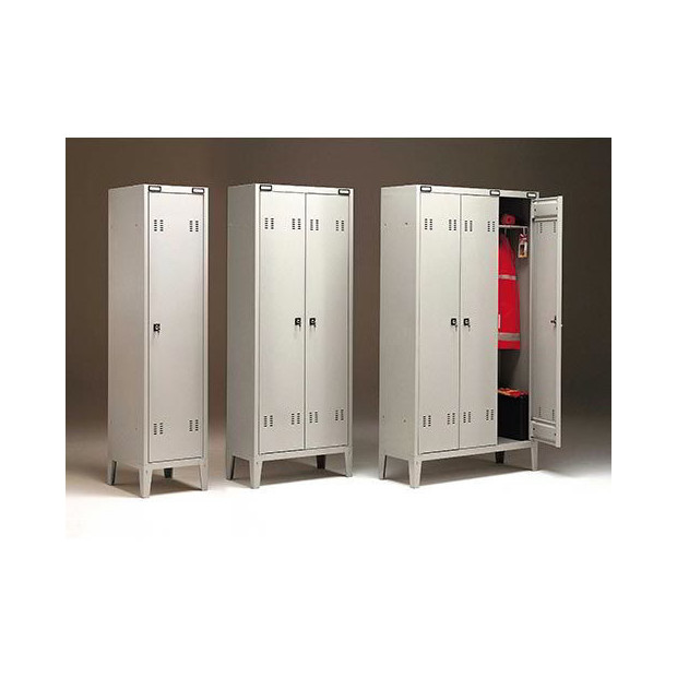 Spogliatoio in metallo per adulti. Struttura portante in lamiera spessore 7/10. Antine montate su cerniere interne antiscasso, dotate di feritoie per areazione interna e chiusura con serratura a chiavi. Un ripiano posaoggetti in ogni vano e portacartellino di serie.