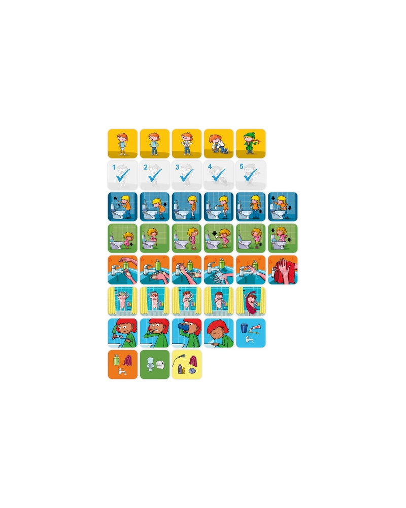 Set di 36 carte per inventare storie e familiarizzare con le routine essenziali di igiene personale. Contenuto: 1 base in plastica, 36 carte plastificate ed una guida didattica. Da 3+ anni.