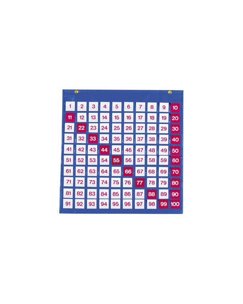 Tabellone in tela con occhielli e tasche trasparenti e 100 carte dei numeri stampate su entrambi i lati. Dimensioni: 68 x 68 cm.