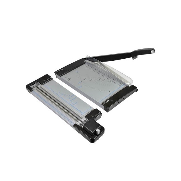 Taglierina multifunzione 2 in 1 - ghigliottina/rotella - A4. Struttura e piano in metallo prestampato con formati DIN. E’ possibile ottenere taglio dritto, taglio a onde o perforazione in linea (per creare linee tratteggiate per pieghe). Facile da usare, precisa e sicura. Lame facilmente intercambiabili. Dimensioni completa : 54x39x8 cm.