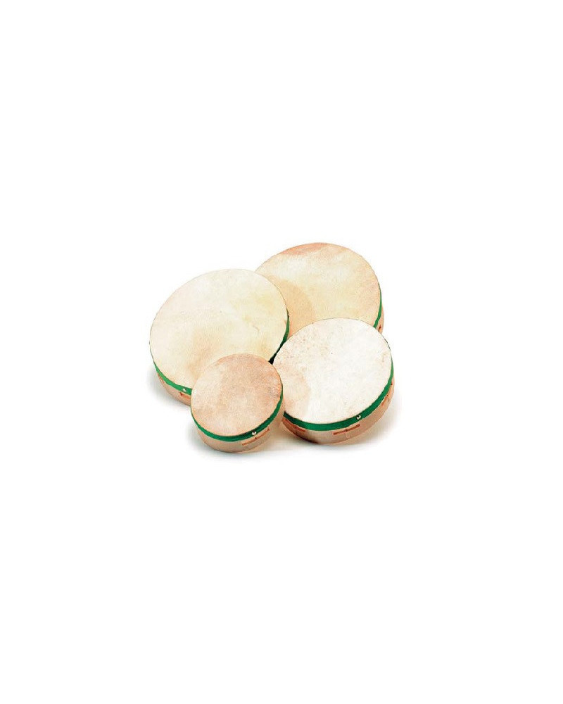 Tamburello in fibra color legno con membrana in pelle naturale e battente in legno. Disponibile in 3 dimensioni