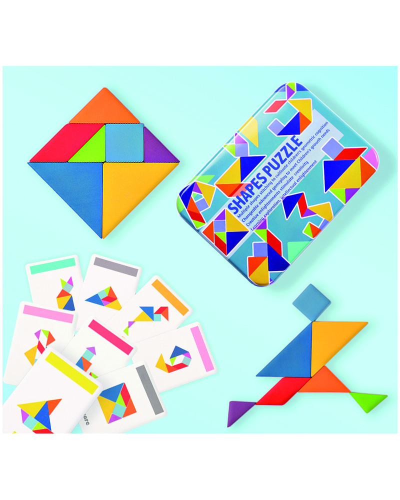 Tangram in legno per formare figure che stimolano l’immaginazione. Contiene 4 tangram da 7 pezzi e 60 schede modello. Dimensione imballo: 17,2 x 12,5 x 3 cm.