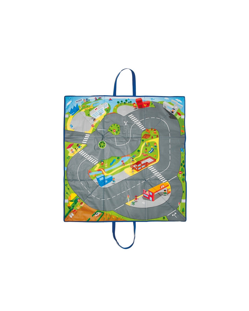 Una volta chiuso questo tappeto stradale si trasforma in un pratico contenitore con manici dove riporre tutti i veicoli e i giochi. In materiale sintetico e lavabile. Aperto misura 100 x 100 cm.