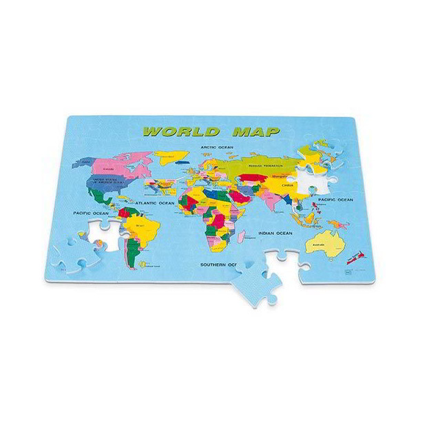 Tappeto in morbida EVA composto da grosse tessere puzzle incastrabili, in modo da formare un grande puzzle che raffigura il planisfero. Ideale come base gioco, il tappeto consente inoltre di affinare le capacità psicomotorie e di imparare le prime nozioni di geografia. Confezione 54 mattonelle in Eva. Dimensione puzzle completo cm. 60x90 spessore cm. 1,2.
