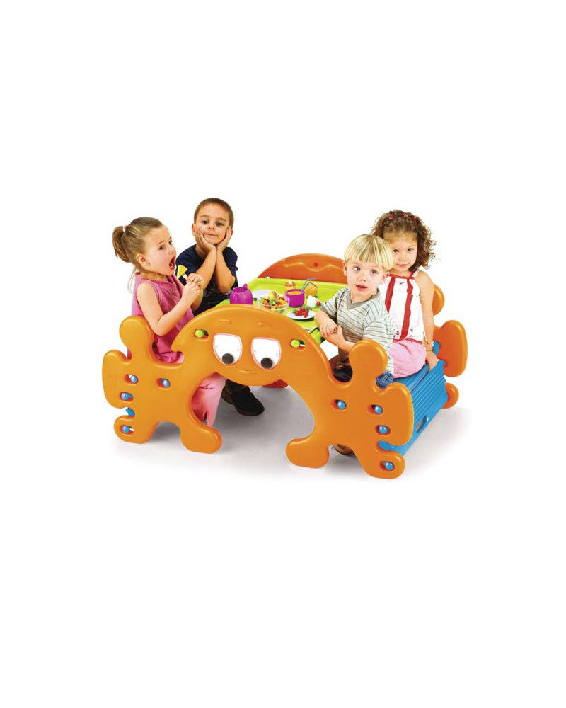 Tavolo da pic-nic composto da un tavolino e due panchette incorporate a forma di fantasmino. Doppia funzione tavolo o dondolo a seconda di come lo si predispone. Fornito di semplici istruzioni per un facile montaggio. Dimensioni: cm 115,5x69x56h.